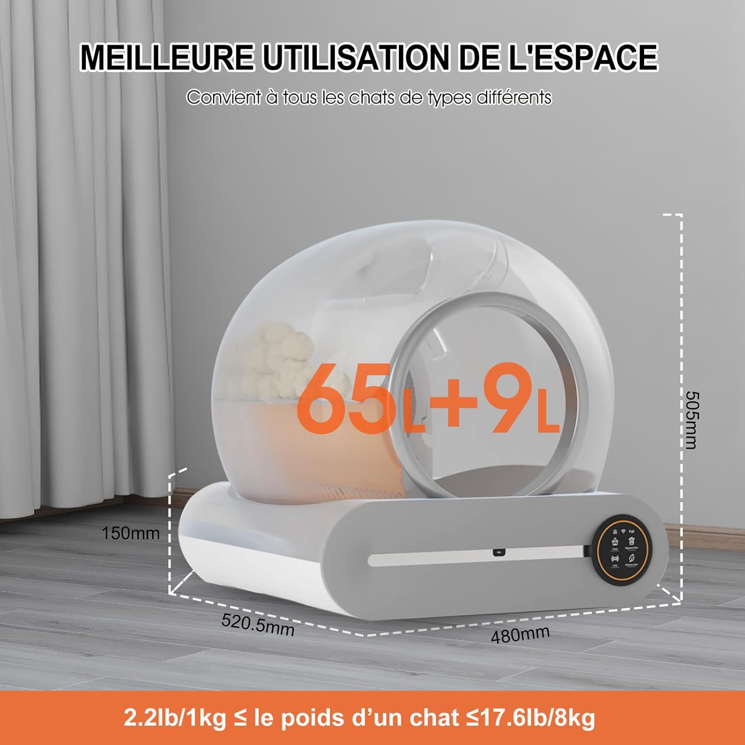 Espace et Confort : 65L de volume intérieur pour un confort optimal jusqu’à 15 jours sans entretien.