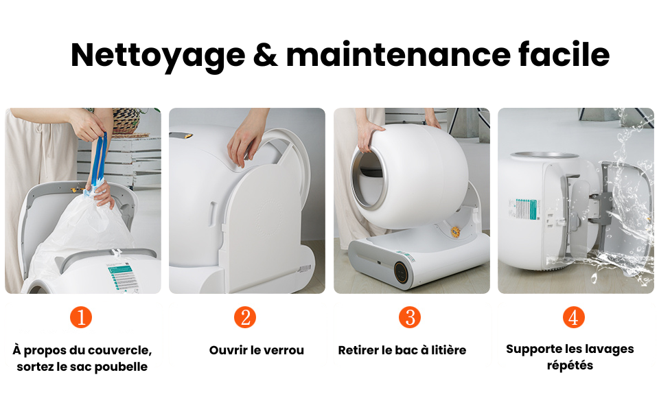 [Facilité d'utilisation] La litière pour chat autonome propose plusieurs modes de nettoyage intuitifs. Avec un simple clic, éliminez les déchets sans effort. Le vidage du bac à litière est simplifié pour une expérience totalement mains libres.